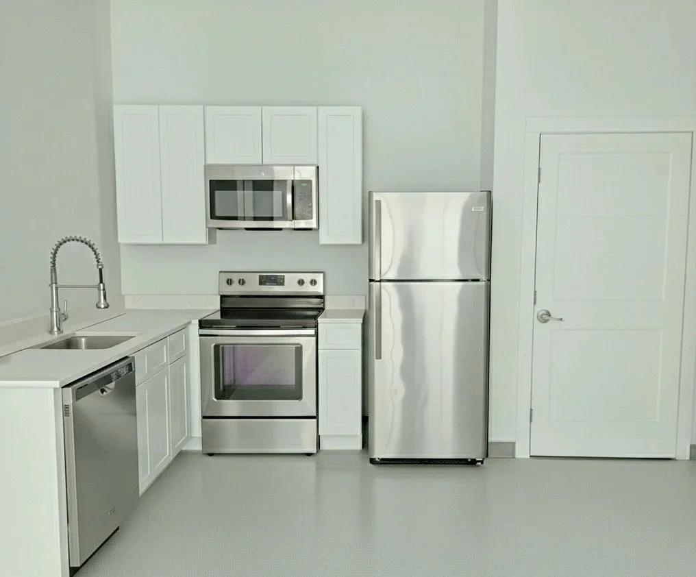 These two and three bedroom luxury townhouse style apartments feature an open concept kitchen and living room, exposed ductwork, central air, quartz countertops, European styled cabinets, and stainless steel appliances.